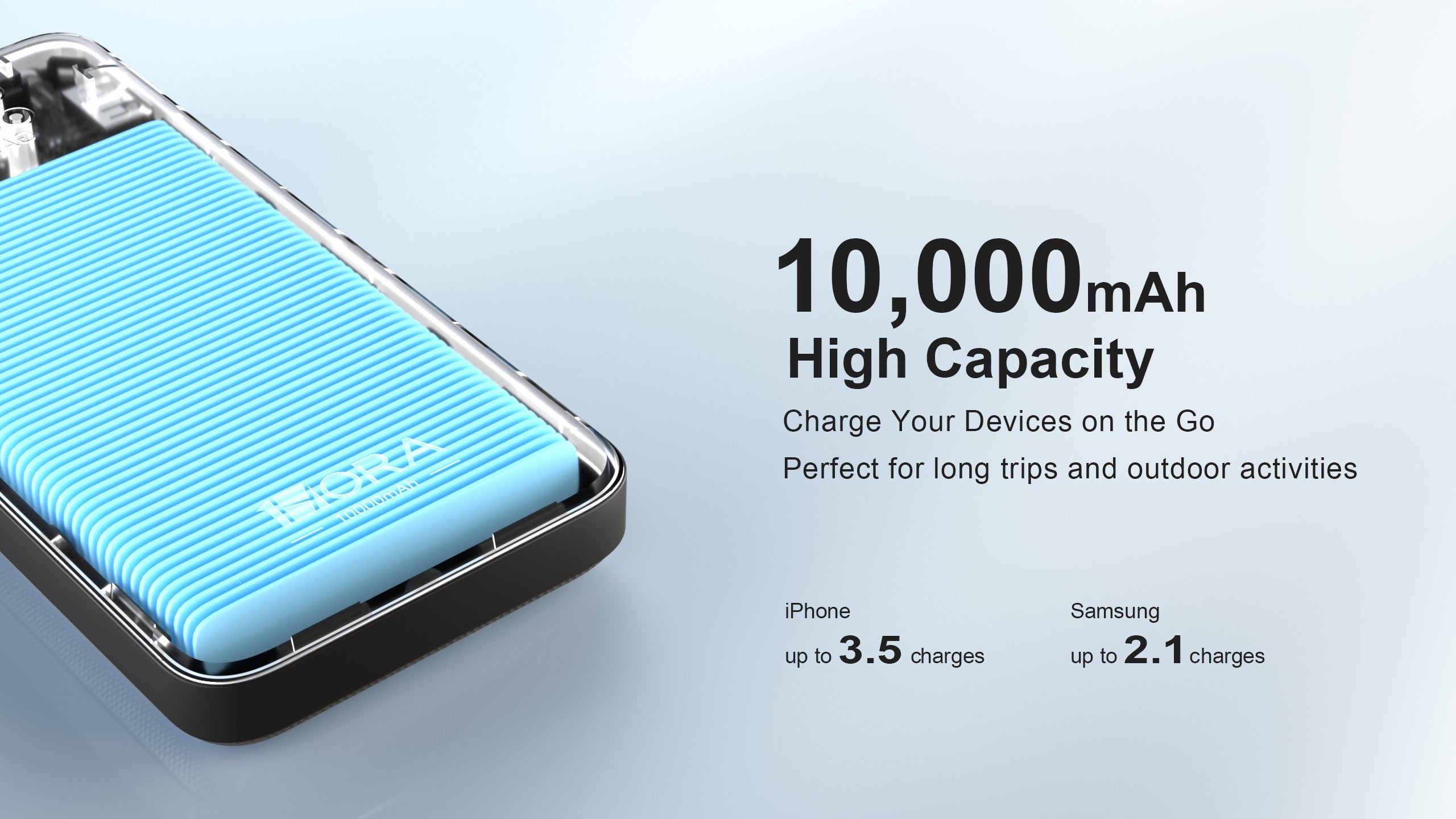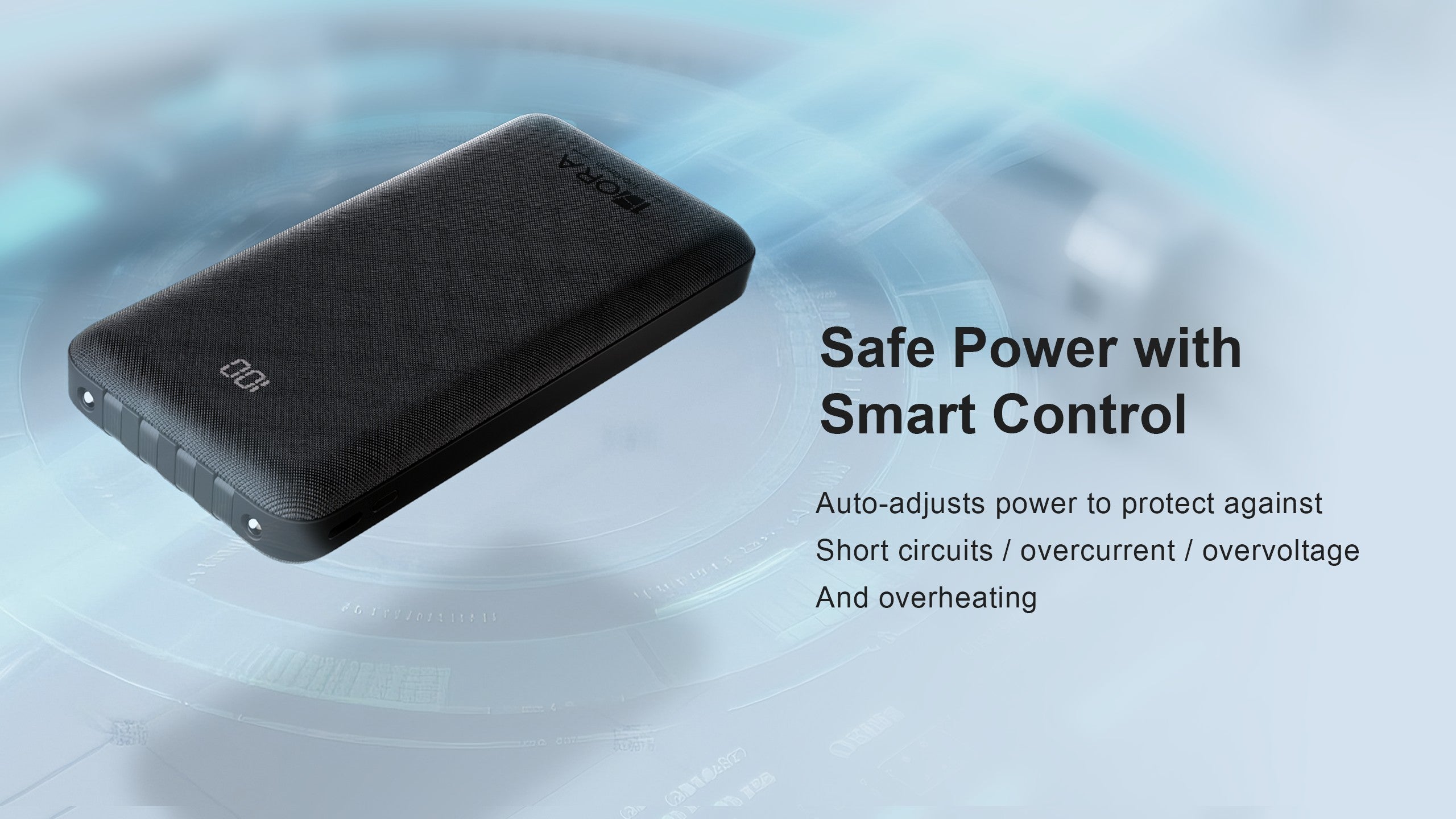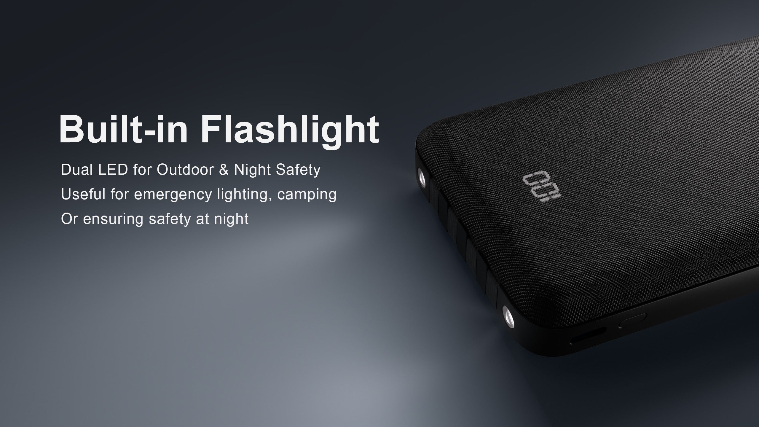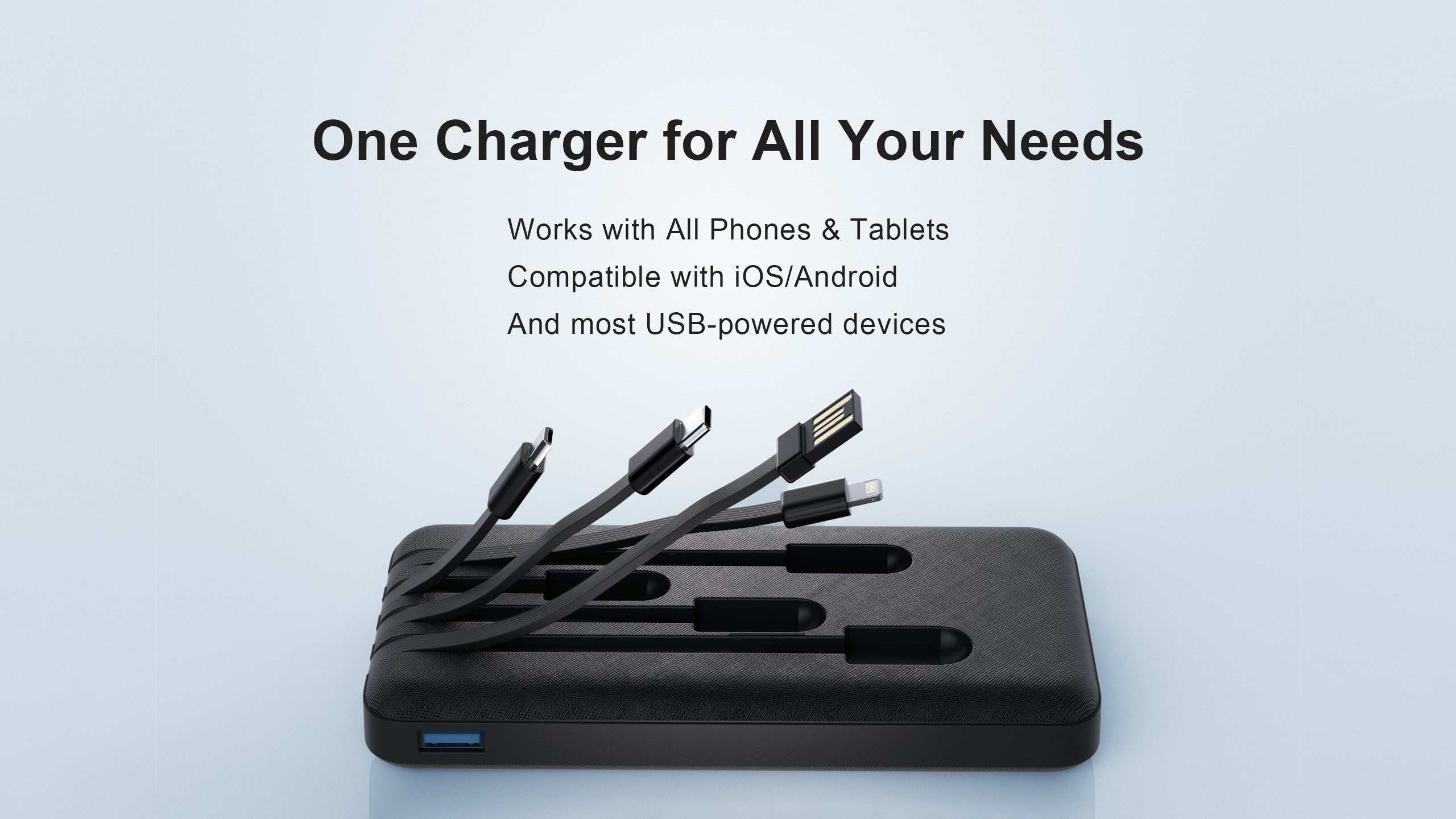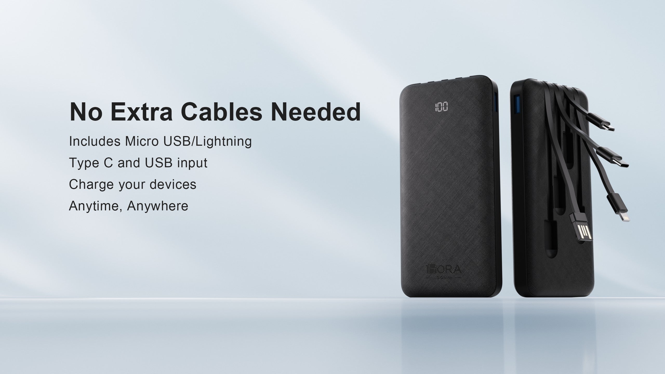 Esta batería externa todo en uno cuenta con cables Micro USB, IP y Tipo-C integrados para carga directa (sin necesidad de cables adicionales), además de LED de linterna y protección mediante chip inteligente para un uso seguro y universal.