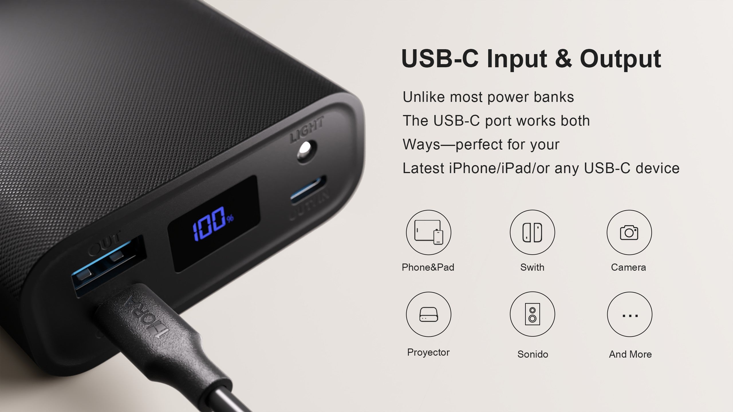 Batería externa de 20.000 mAh con carga rápida PD de 20 W: incluye entrada/salida tipo C, dos puertos USB para cargar tres dispositivos simultáneamente, indicadores LED de energía y un cable de carga rápida.