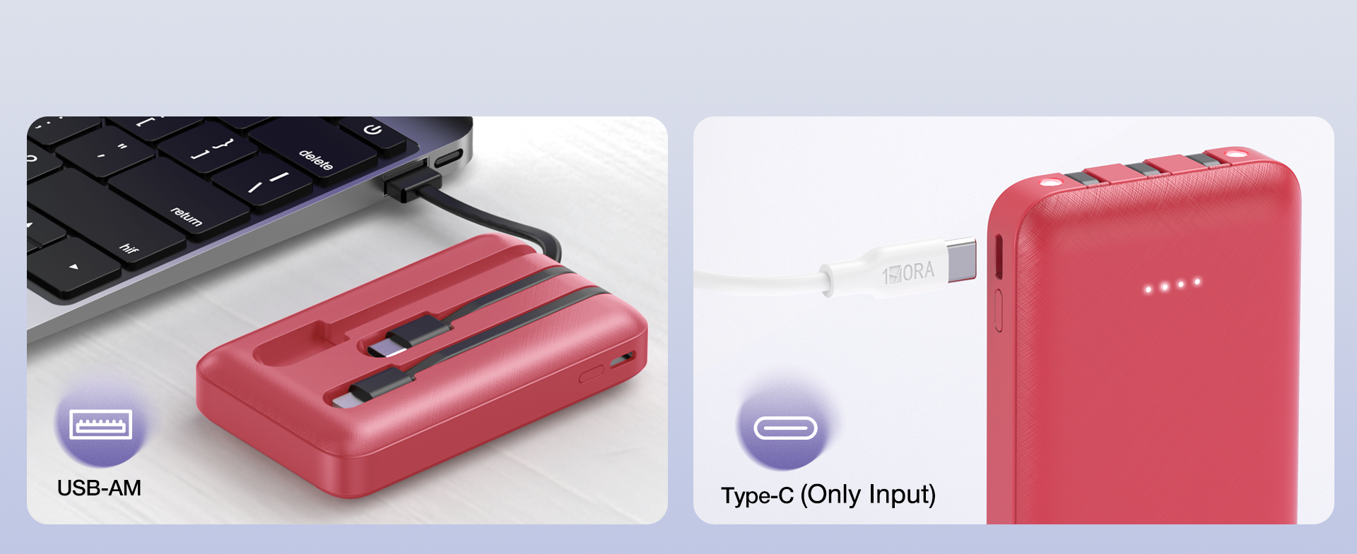 Admite la carga de múltiples dispositivos: cable USB-C para teléfonos, incluido el iPhone 15, cable Lightning para iPhone 6-14 y cable USB-A para baterías externas. El puerto USB-C solo admite carga de USB-C a Lightning, no de USB-C a USB-C; el puerto USB admite la carga estándar de teléfonos mediante USB.