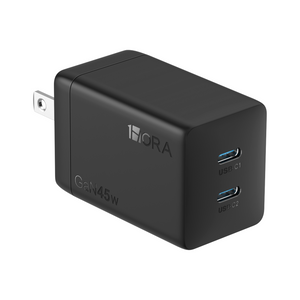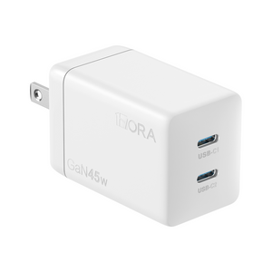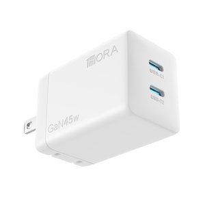 Compact GaN wall charger with dual USB-C ports delivering up to 45W max output. Supports fast charging for phones, tablets, and other USB-C devices, featuring wide 100–240V input and an included 1m Type-C to Type-C cable—ideal for home, office, and travel.