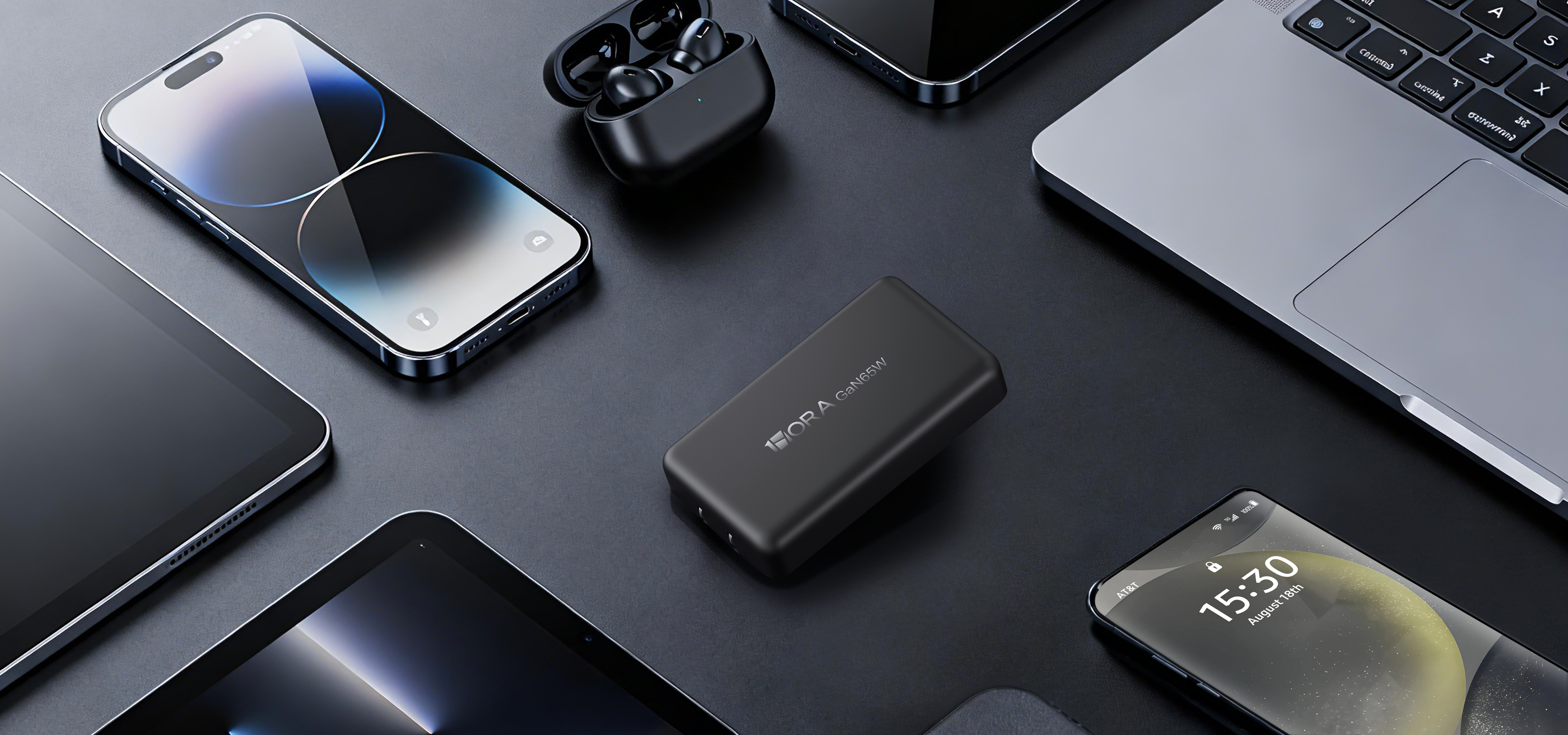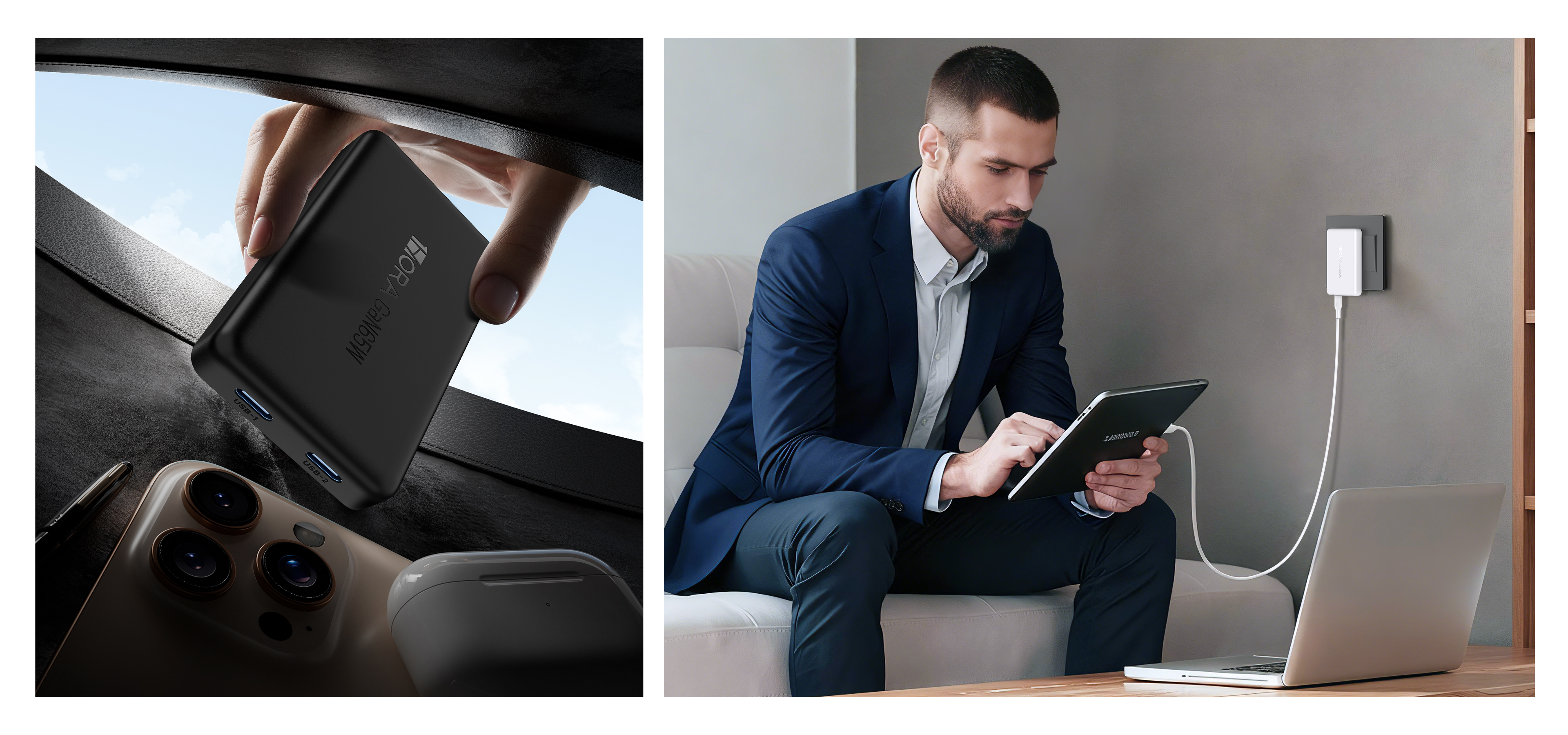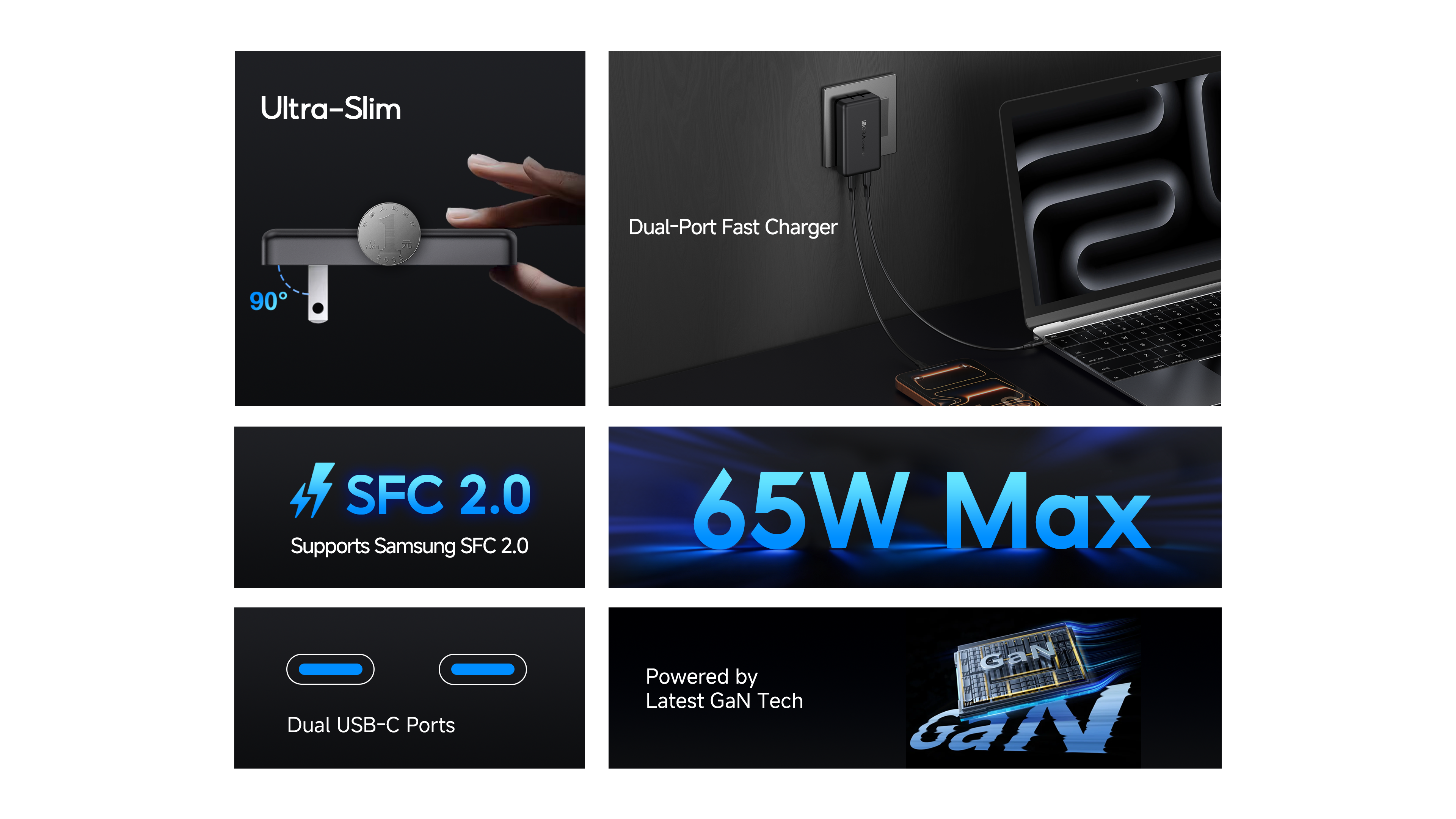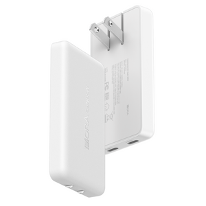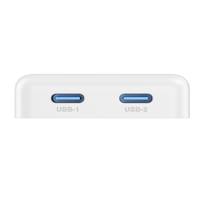 Compact GaN wall charger with dual USB-C ports delivering up to 65W max output. Fast-charge laptops, tablets, and phones with wide 100–240V input and the included 1m Type-C to Type-C cable—perfect for home, office, and travel.