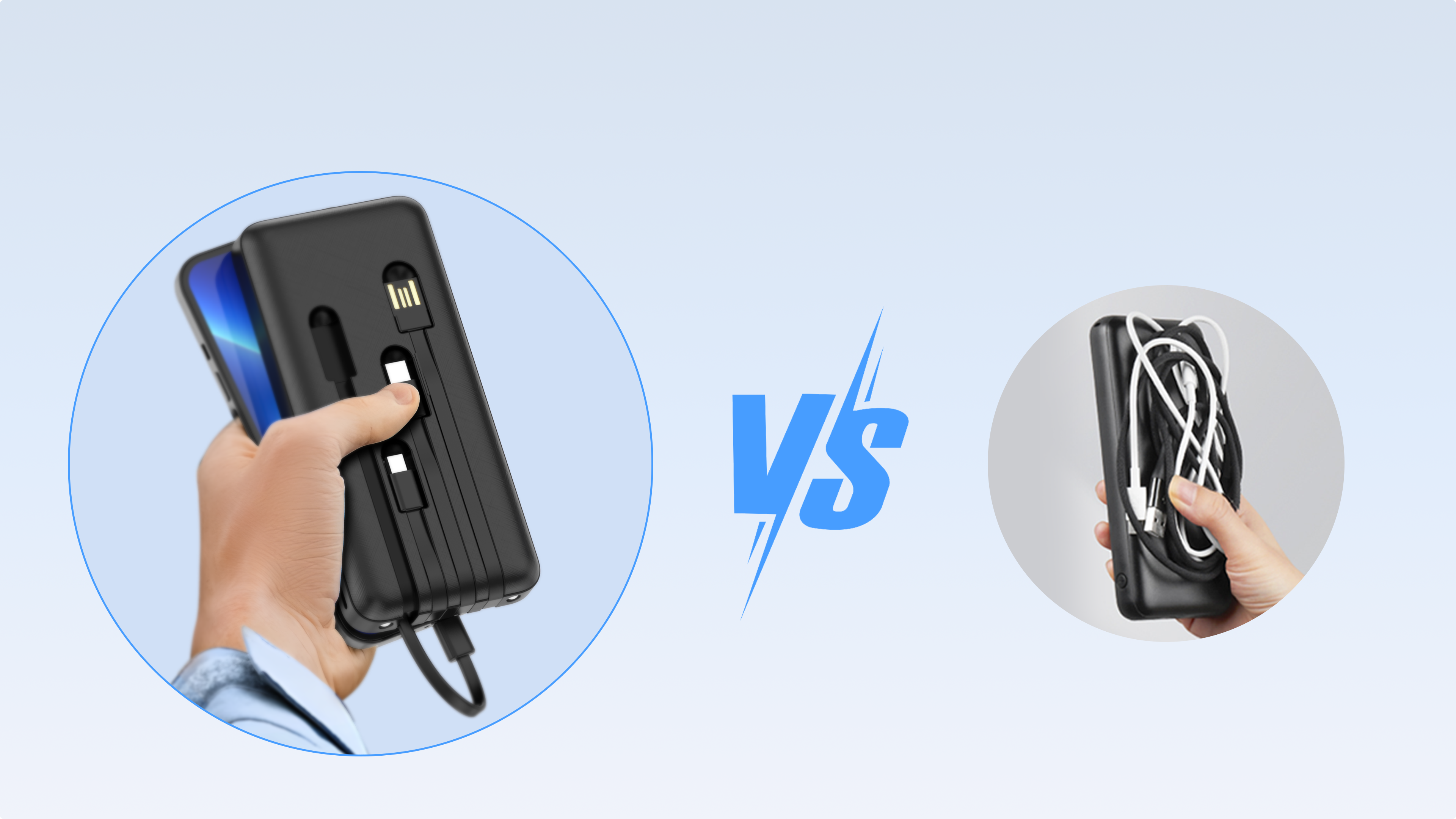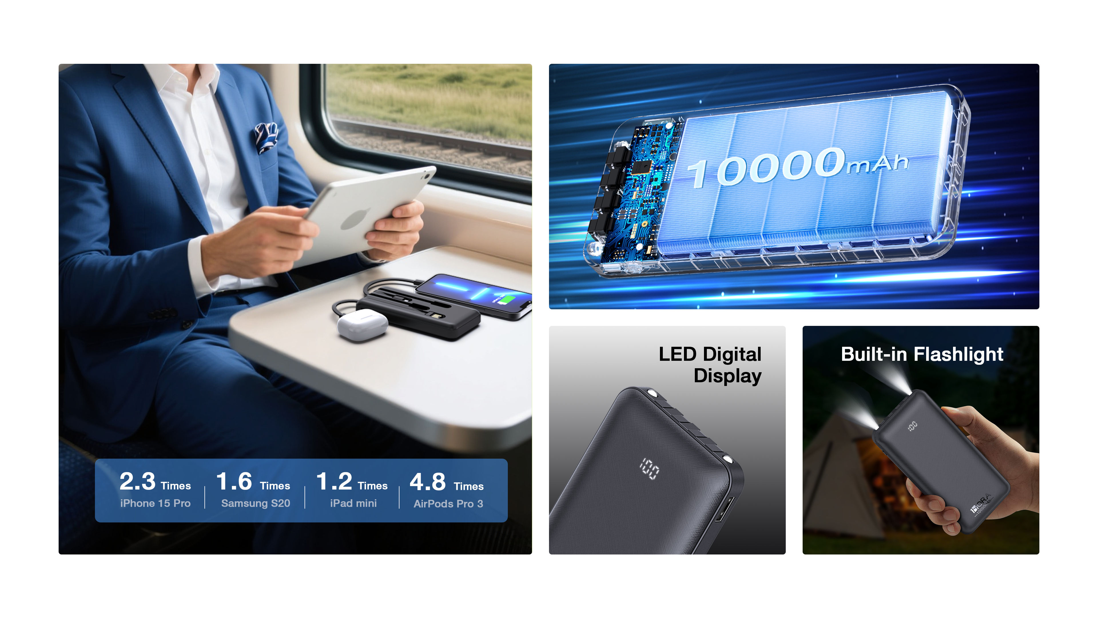 This all-in-one power bank features built-in Micro USB, IP, and Type-C cables for direct charging—no extra cables needed—plus flashlight LEDs and smart chip protection for safe, universal use.