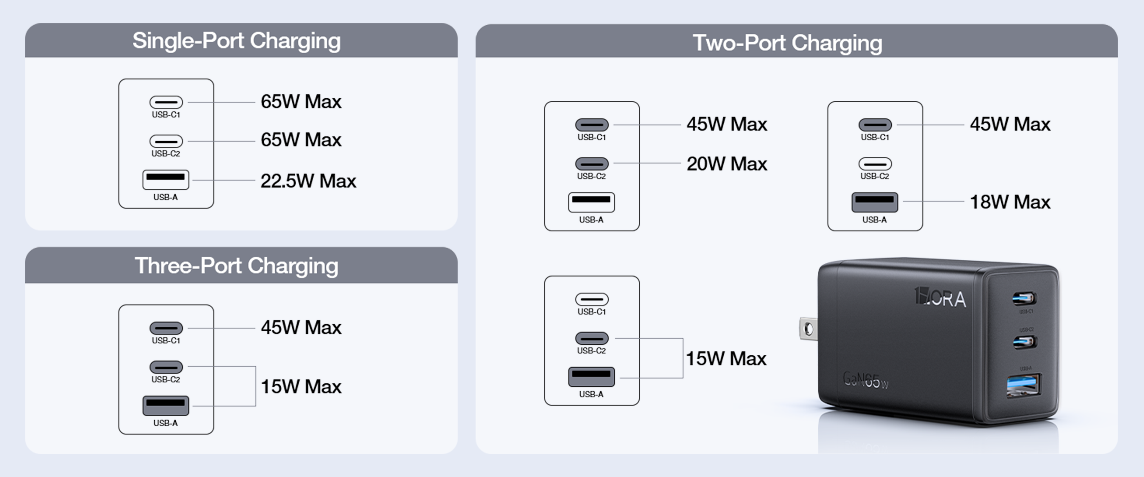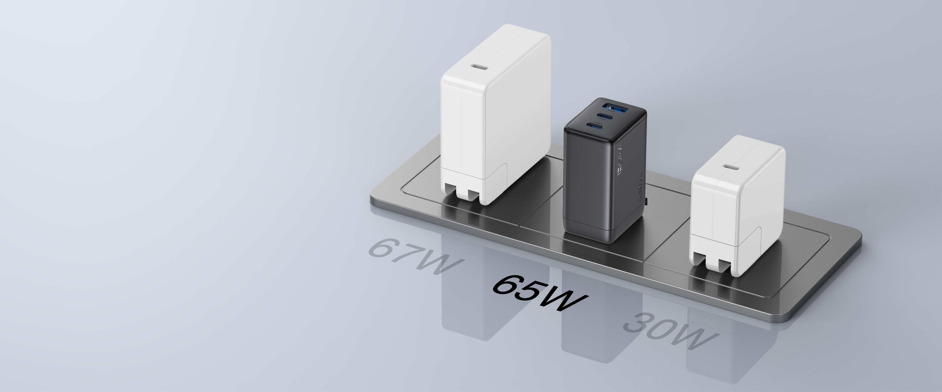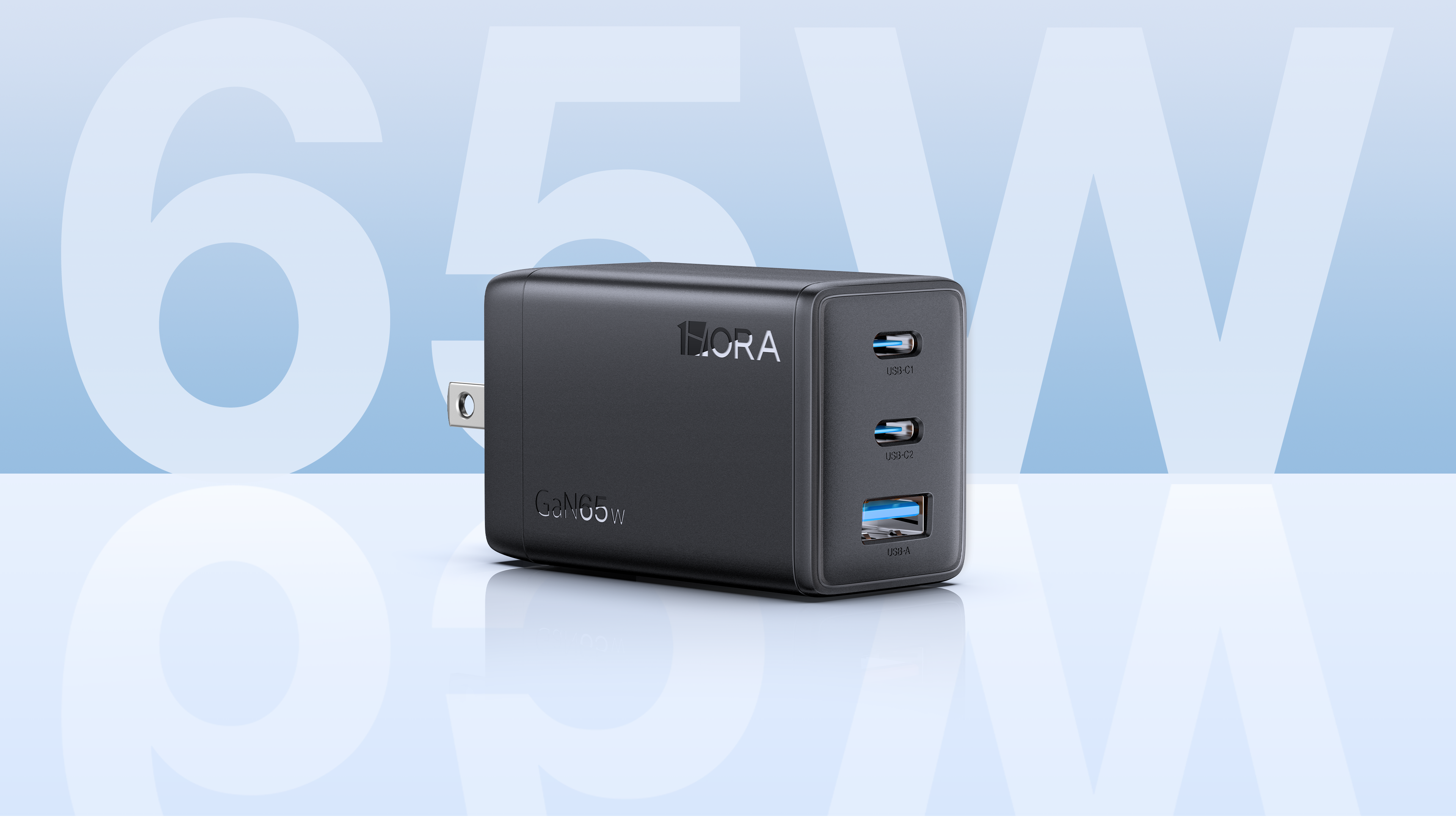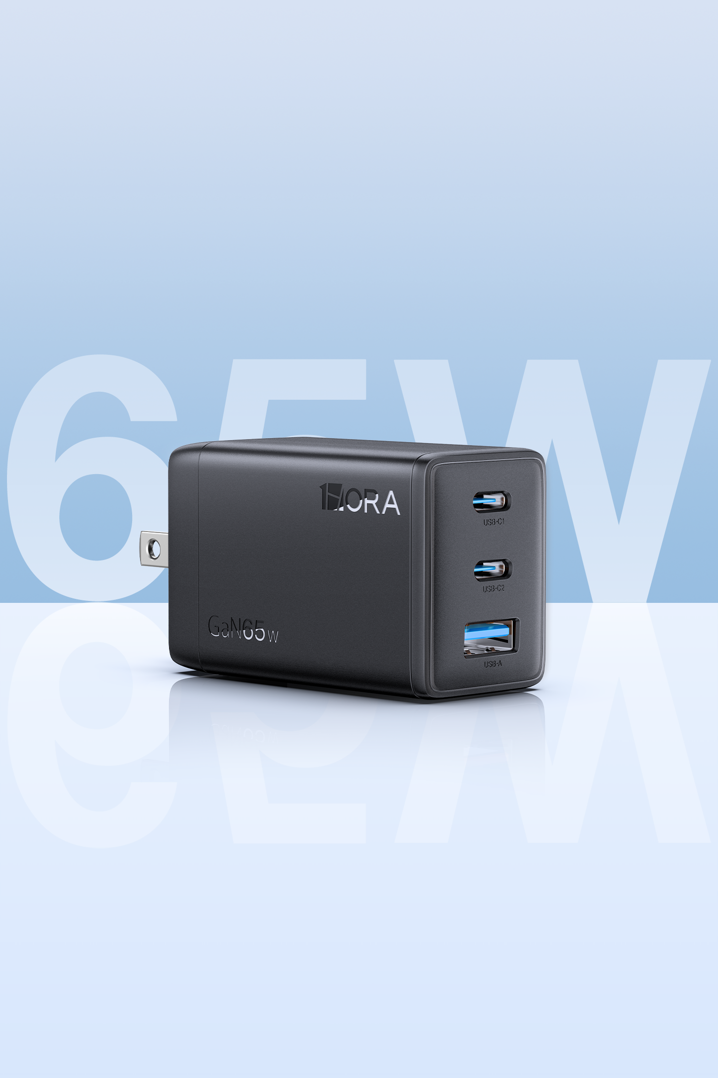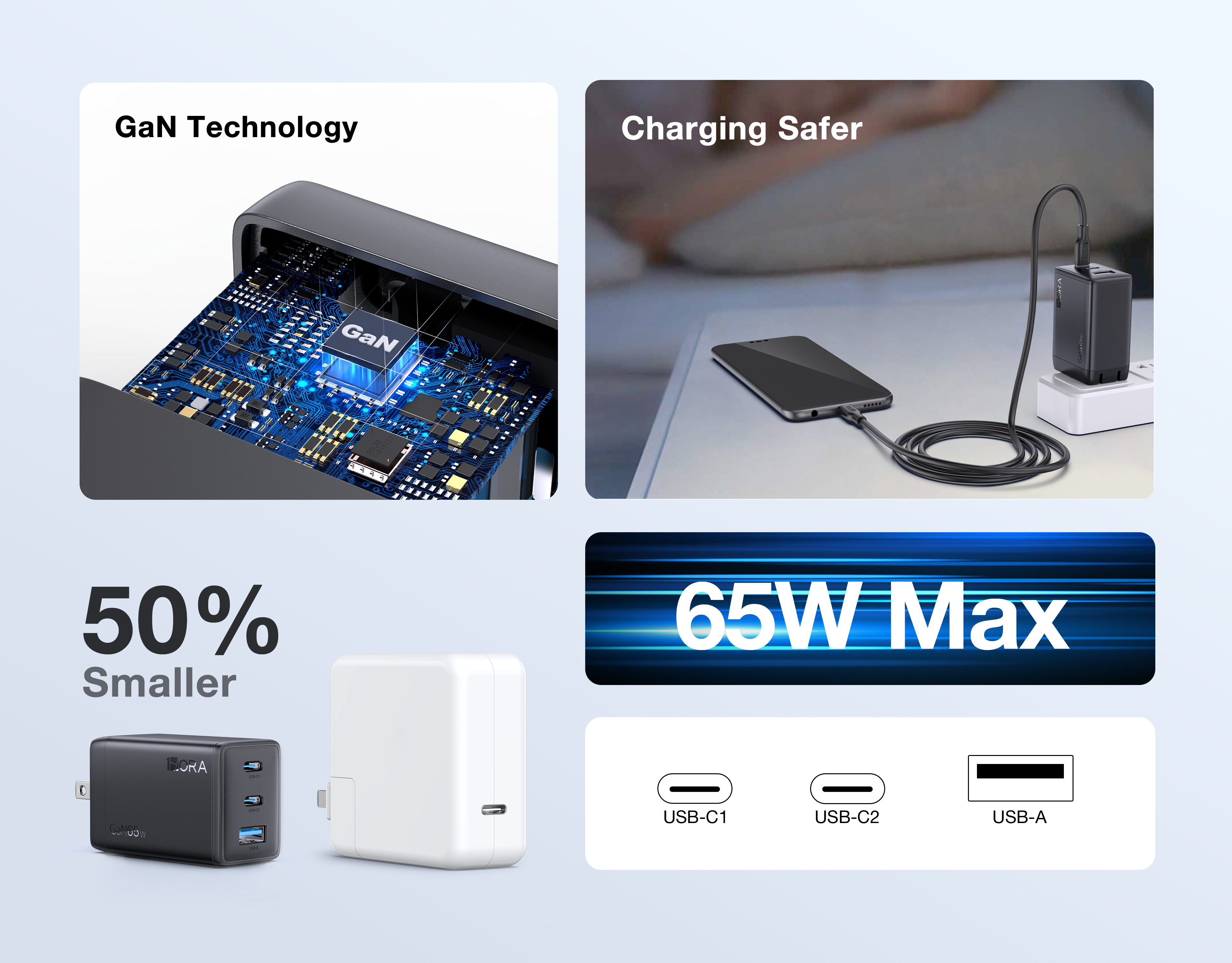 Charge up to 3 devices simultaneously with this compact 65W GaN charger, featuring dual USB-C and one USB-A port, fast USB-C PD 3.1/PPS charging, and wide compatibility with phones, tablets, laptops, and more — perfect for travel or home use.