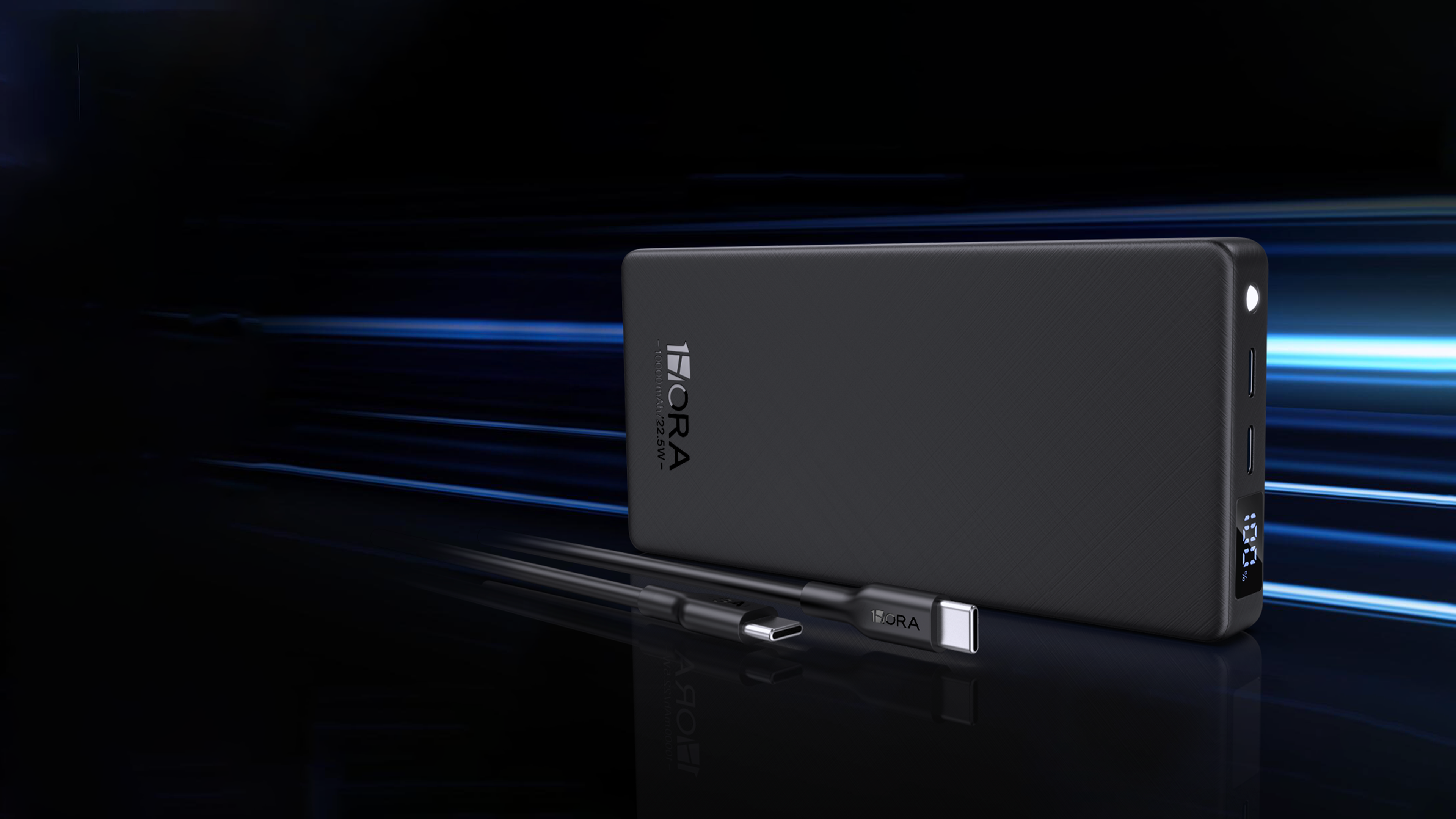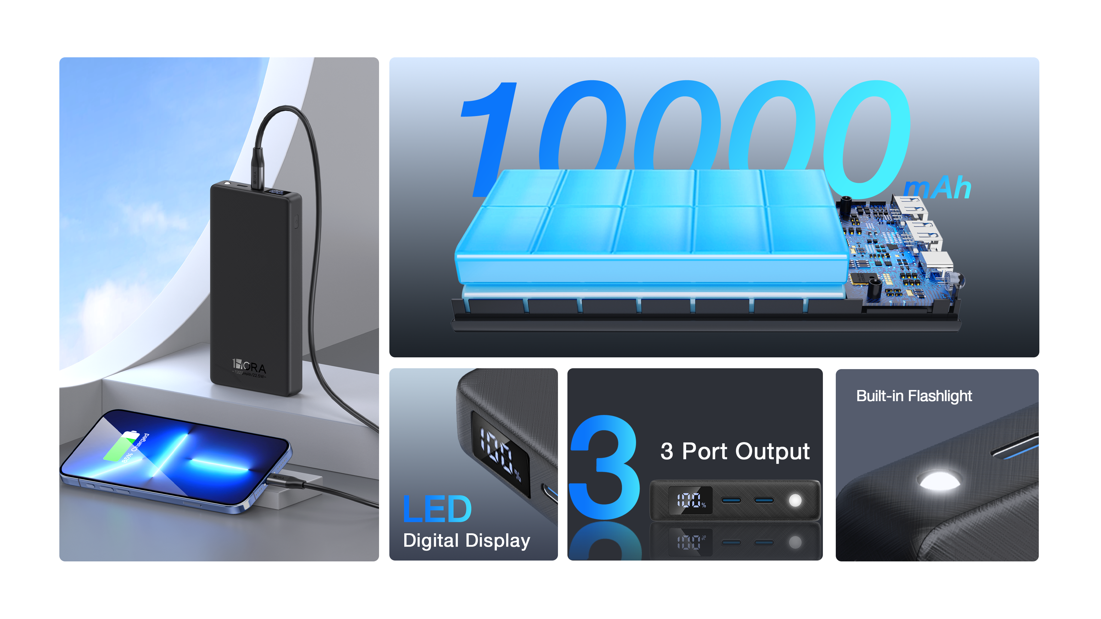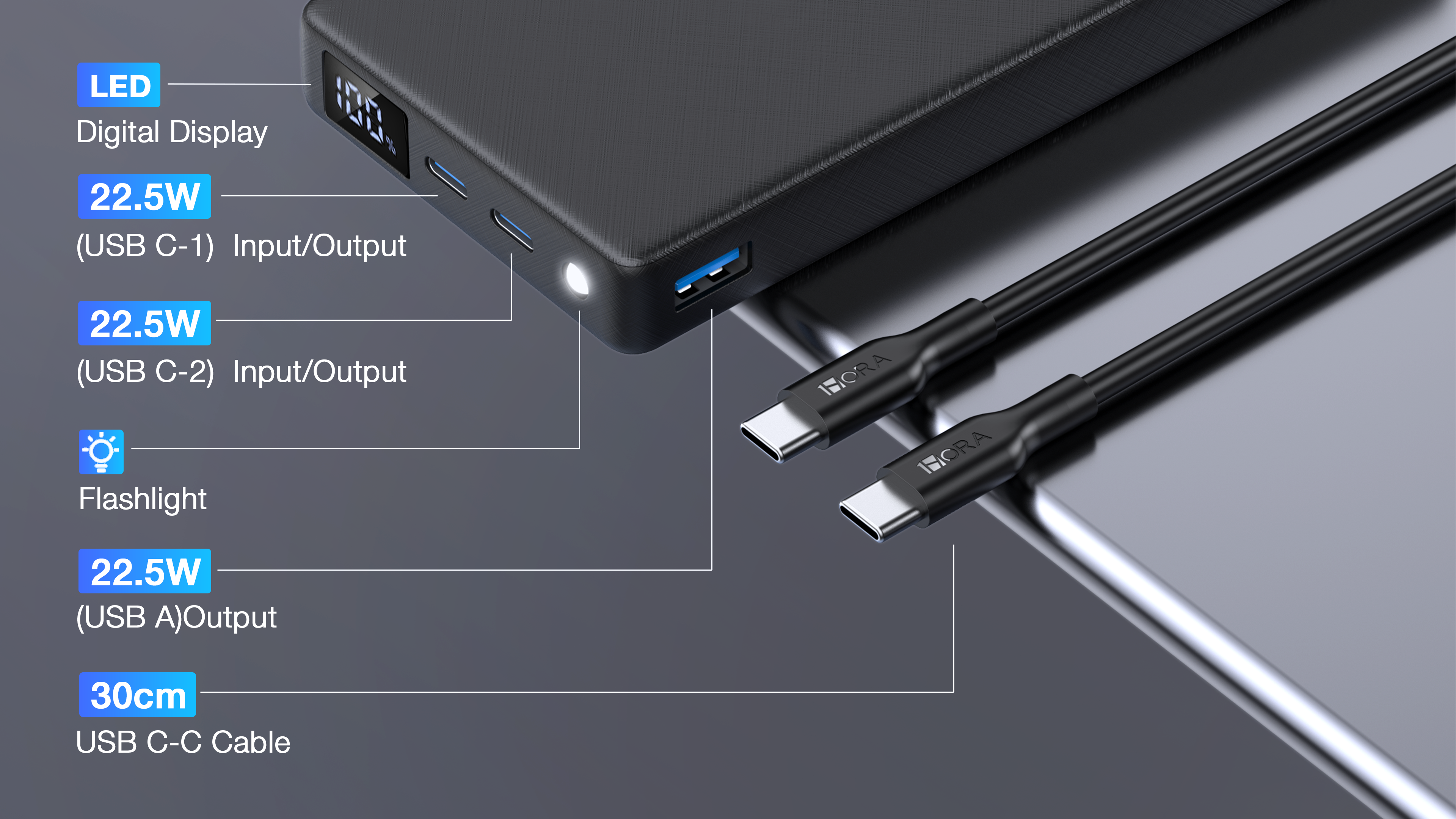 22.5W fast-charging power bank with dual ports, LED display, flashlight, and 10,000mAh capacity—lightweight, safe, and perfect for on-the-go use. Comes with a 30cm Type-C cable.