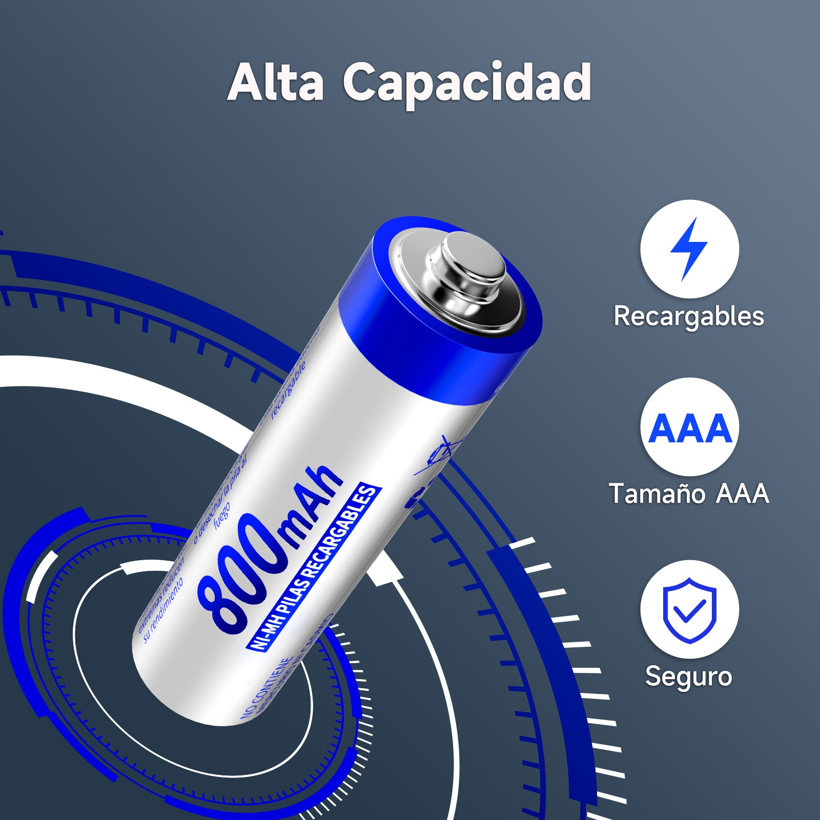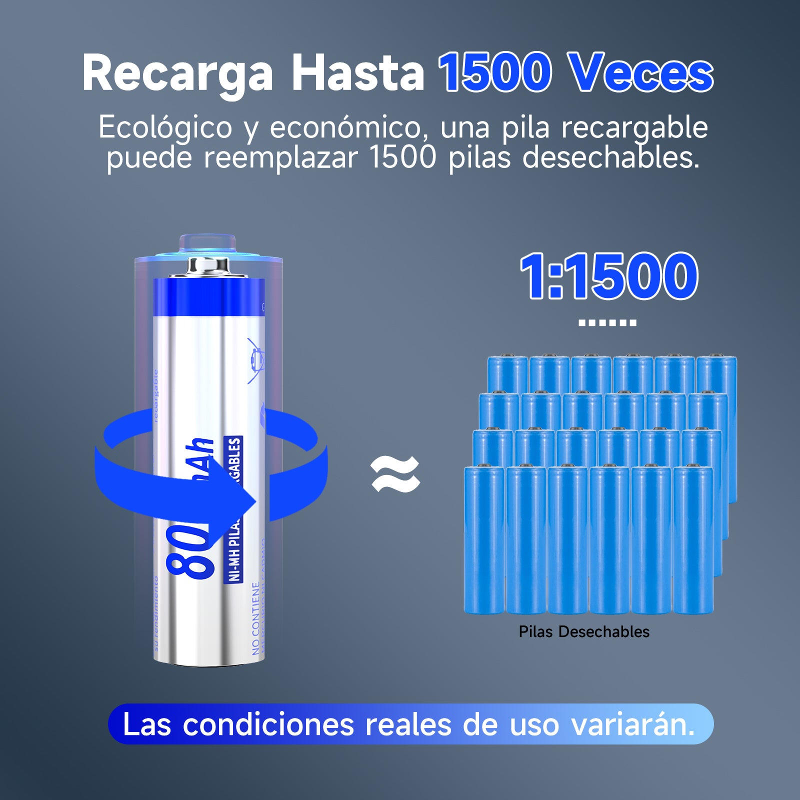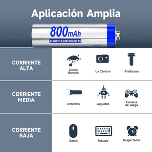 Acerca de este artículo Alta Capacidad, Larga Vida: Potente y versátil batería recargable AAA de 800 mAh. Dura 2 veces más que las pilas alcalinas. Almacena hasta 5 años cuando no está en uso. Económico y Ecológico: El material duradero y confiable le permite recargarlo hasta 1500 veces, lo que equivale a comprar 1500