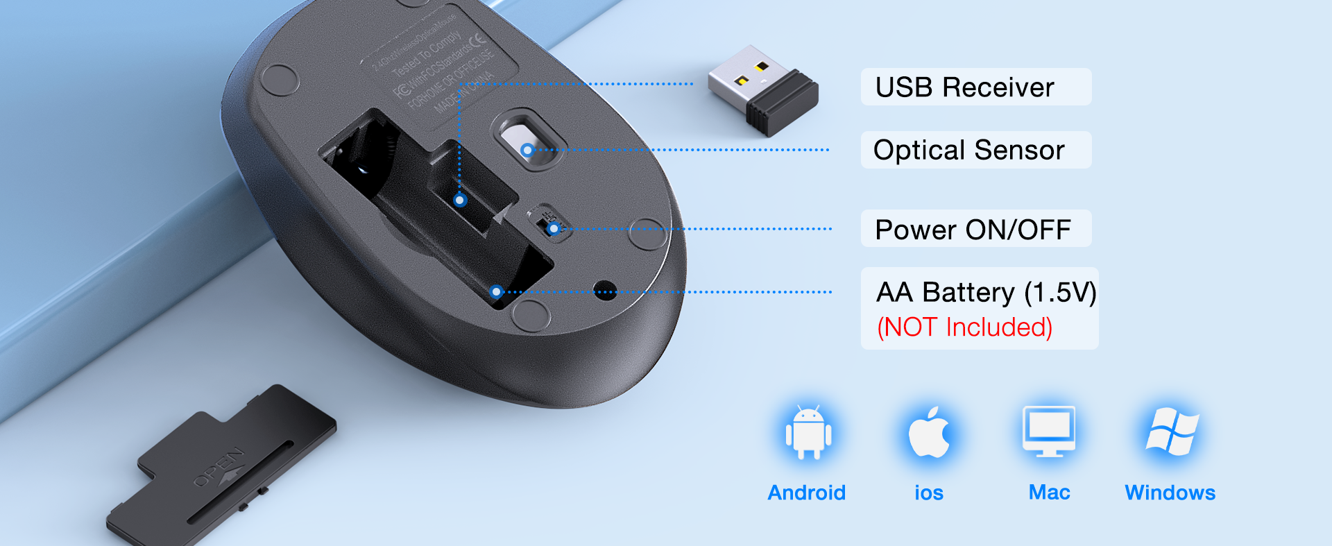 This 2.4GHz wireless mouse offers stable 10m connection with 3 DPI levels (1600/1200/800) for precise tracking. Ergonomic design with soft rubber grip and palm rest ensures comfort. Ultra-silent clicks reduce noise by 90%, compatible with Windows/macOS/Linux/Chrome OS/Android via USB receiver.