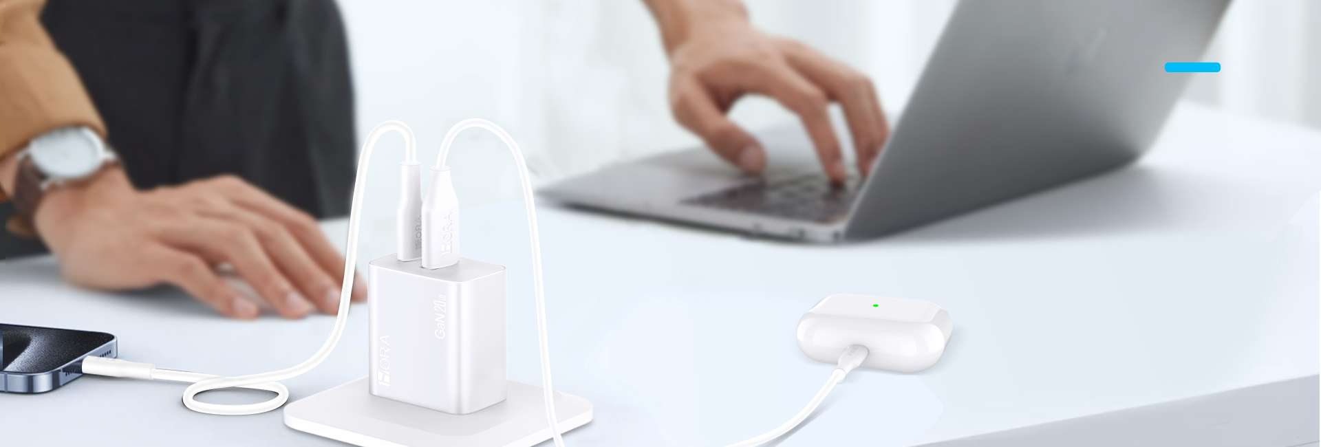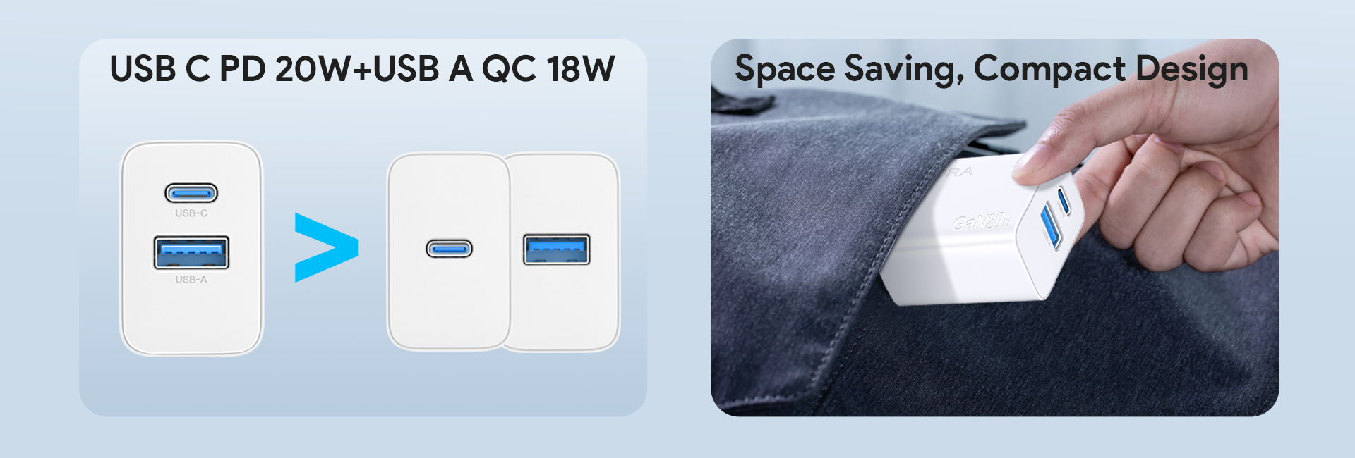 The 2-port charger offers outputs of 20W from USB-C and 18W from USB-A, with a total output of 15W when both ports are used. Includes a 1-meter Type-C cable and supports input of 100-240V.