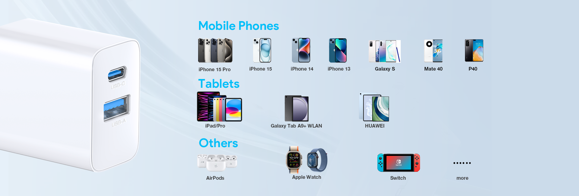 2-Port Fast Charger offers ultra-fast charging with USB-C PD 3.0 (20W) and USB-A (18W), charging your iPhone 14, 13, or 12 to 70% in 30 minutes and other devices to 50% in 45 minutes.